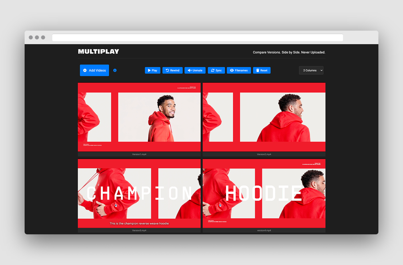 The easiest way for video creators to compare multiple video edits, in perfect sync.