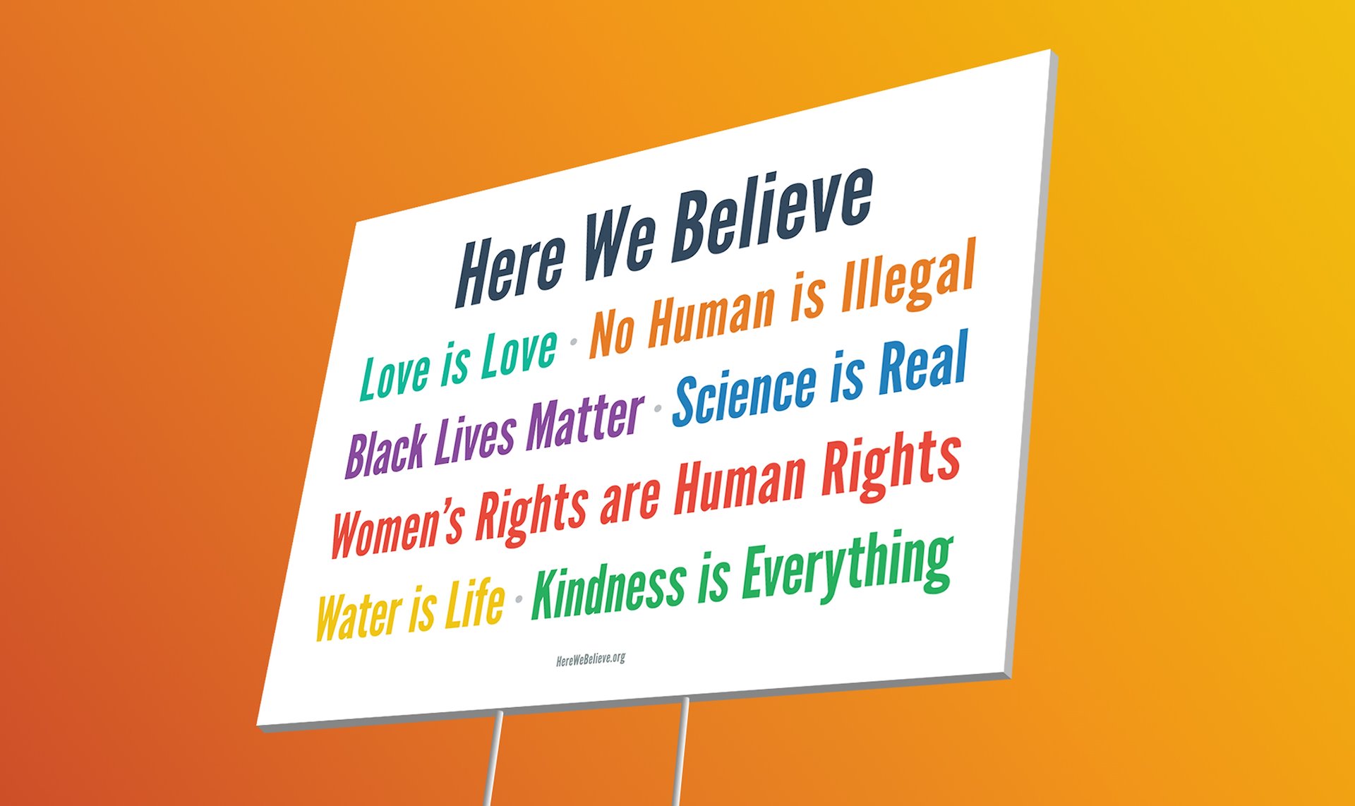 Here We Believe was started in December of 2016, in the wake of the US presidential election. Through the sale of signs, Here We Believe raised funds to support progressive organizations who fight every day for social and environmental justice. Initially a local effort in Evanston, Illinois, Here We Believe signs quickly caught on state-wide, and soon they were in front yards, schools, store windows and marches, all over the United States.