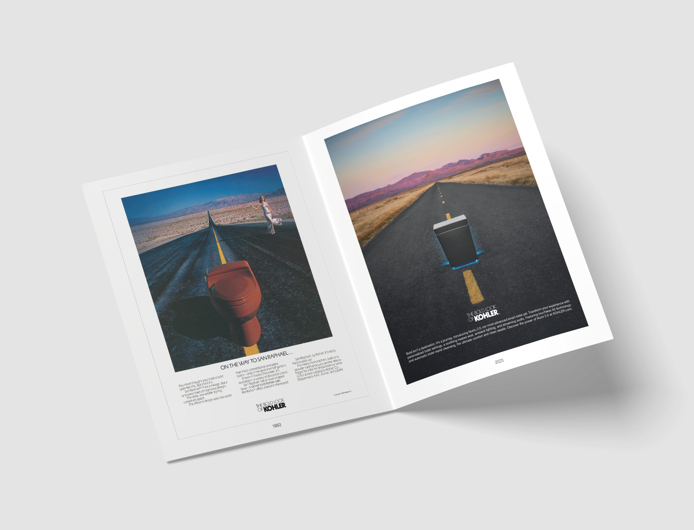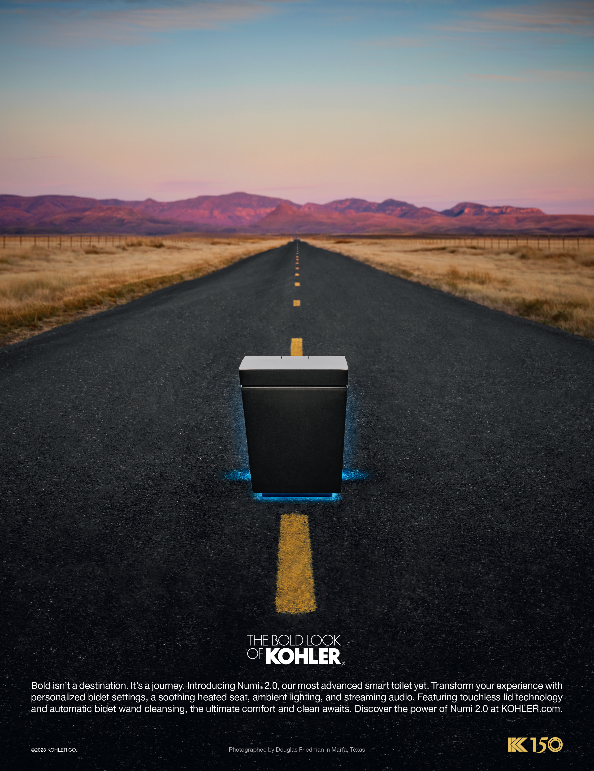 In the early 1970s, Herb Kohler created a force with THE BOLD LOOK OF KOHLER that transformed the American bathroom from a utilitarian space into one of design, style, sophistication, and craftsmanship. His provocative advertising campaigns challenged conventional norms. One of the most iconic ads from the 1980s came to be known as “the toilet in the road” and we reprised that ad in 2023 with breakthrough imagery and video featuring its award-winning Numi 2.0 smart toilet.
